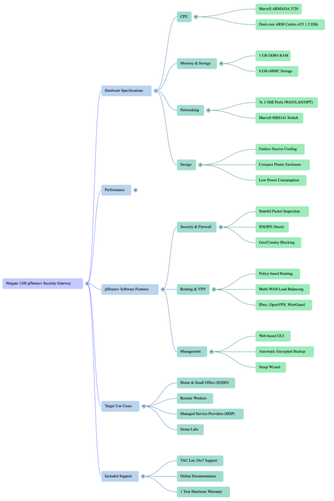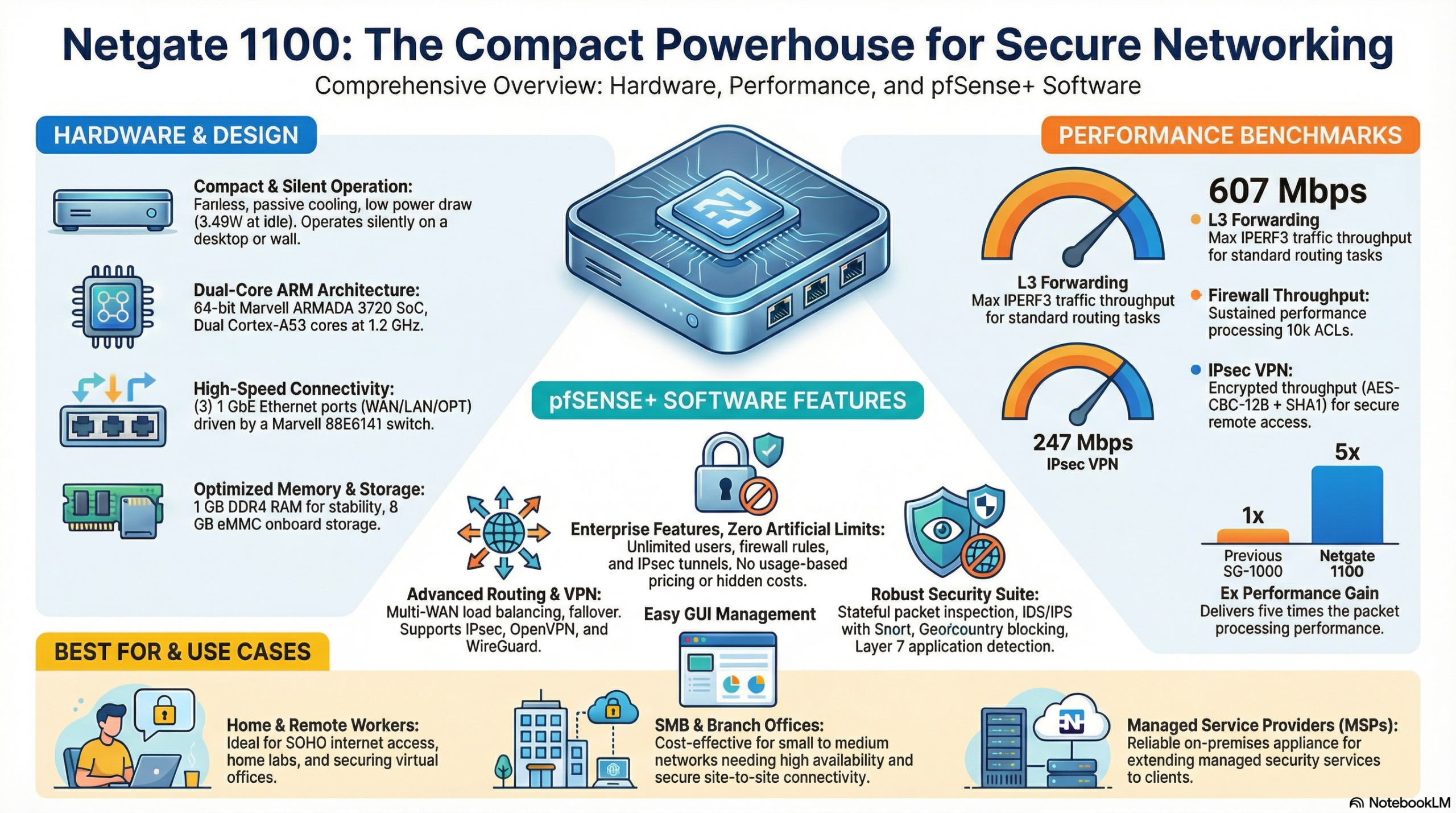 The Netgate 1100 is a compact security gateway designed to provide robust networking capabilities for home officesand small businesses. This fanless micro-appliance features a dual-core ARM processor, three Gigabit Ethernet ports, and low power consumption for silent, efficient operation. Pre-installed with pfSense Plus software, the device supports advanced functions such as firewall protection, VPN connectivity, and traffic load balancing without additional licensing fees. It delivers a significant performance boost over its predecessor, making it a cost-effective solution for remote workers and managed service providers. The hardware package includes a one-year warranty and access to 24/7 technical support to ensure reliable deployment.