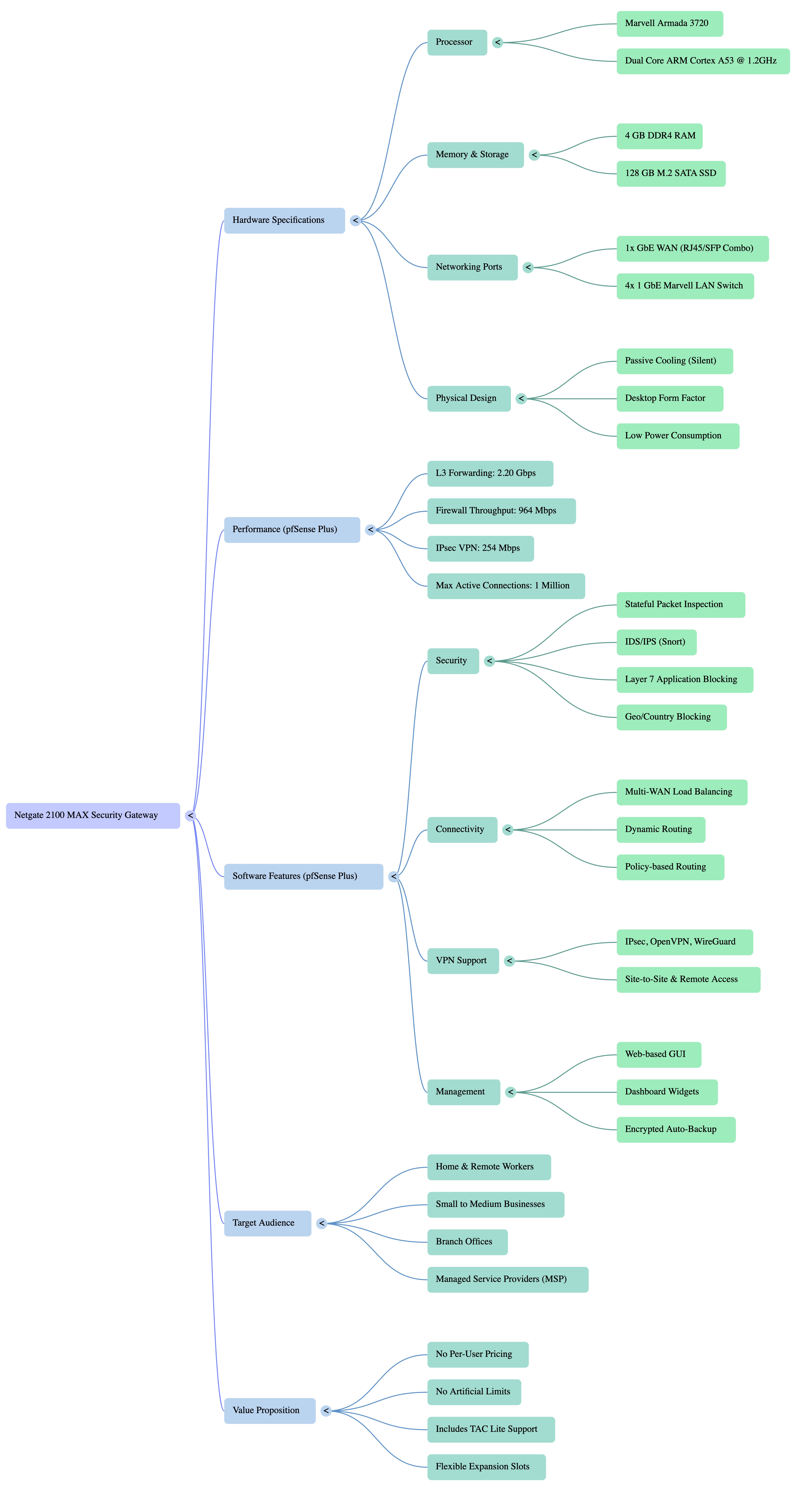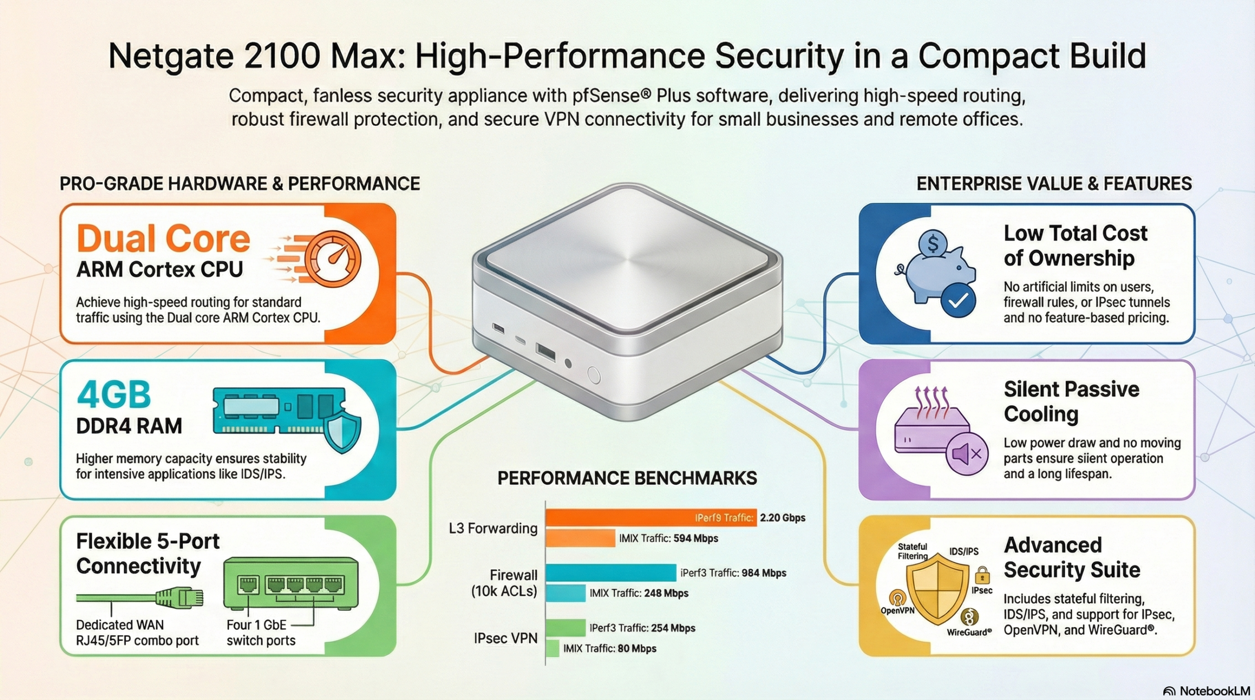 The provided text details the Netgate 2100 Max, a compact and efficient security gateway designed for home offices and small businesses. This hardware utilizes pfSense Plus software to provide robust firewall protection, high-speed routing, and secure VPN connectivity. Key technical specifications include a dual-core ARM processor, 4GB of RAM, and versatile networking ports that support both copper and fibre connections. The device is marketed as a low-power, silent solution that avoids the high costs of proprietary alternatives through an unlimited user license model. Additionally, the source highlights the appliance’s expandability, including slots for extra storage or wireless modules, alongside comprehensive support services.