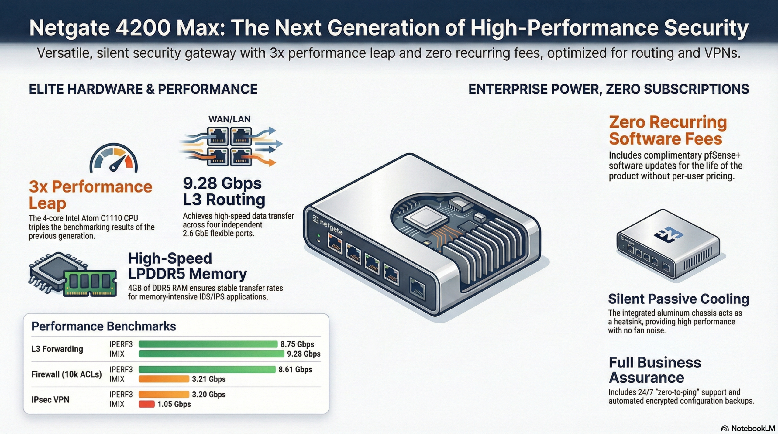 The Netgate 4200 Max is a high-performance security gateway designed for versatile networking environments ranging from prosumer homes to medium-sized businesses. Powered by a quad-core Intel Atom CPU and 4 GB of DDR5 memory, this device offers significant speed improvements for routing, firewalling, and VPN tasks compared to previous models. It features four independent 2.5 GbE ports, allowing for flexible configurations such as dual WAN or high-availability failover. The appliance operates silently using a passive cooling system and comes pre-installed with pfSense Plus software, which supports advanced features like intrusion detection and traffic shaping. Furthermore, the product is marketed as a cost-effective solution with no ongoing software subscription fees and inclusive 24/7 technical support.